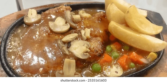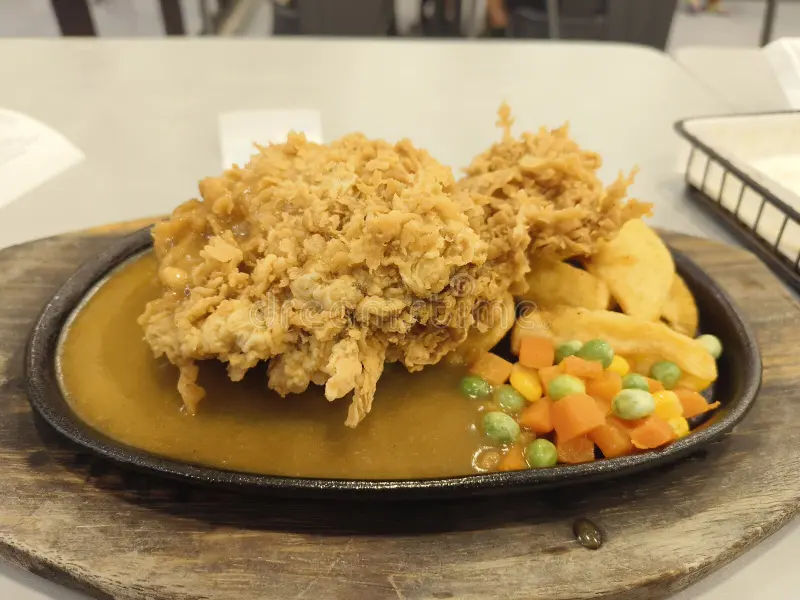 The portion is generous, with a side of vegetables like carrots, peas, corn, and crispy potato wedges. The chicken is cooked to perfection, tender on the inside, and crispy on the outside. For just around IDR 30,000, it’s an amazing deal. The savory sauce adds another layer of flavor to this already fantastic dish.